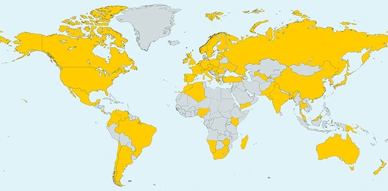 Algeria (1), Argentina (7), Armenia (3), Australia (12), Austria (14), Bangladesh (1), Belgium (1), Brazil (8), Canada (7), Chile (2), China (20), Colombia (1), Costa Rica (2), Czech Republic (4), Ecuador (1), Estonia (1), Finland (1), France (15), Germany (8), Greece (1), Hungary (9), India (2), Ireland (3), Italy (26), Japan (14), Kenya (1), Latvia (1), Lithuania (5), Madagascar (1), Malaysia (1), Mexico (9), Morocco (2), Namibia (1), Netherlands (5), New Zealand (4), Nigeria (1), Norway (2), Pakistan (1), Papua New Guinea (1), Poland (9), Portugal (5), Romania (1), Russia (13), Serbia (4), Slovenia (1), Slovak Republic (1), South Africa (6), South Korea (1), Spain (8), Sweden (1), Switzerland (4), Thailand (3), Turkey (2), Ukraine (1), United Kingdom (13), USA (33), Uzbekistan (1), Venezuela (3), Yemen (1), Zimbabwe (2).